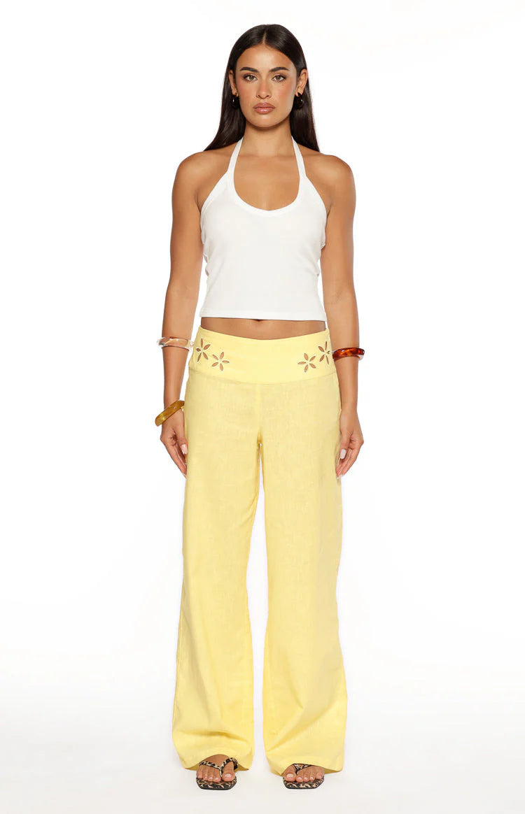 Your new favourite statement pants have arrived! Meet our Alamara Yellow Floral Detail Wide Leg Pants, a perfect piece for a casual outing or a summer adventure. Crafted from lightweight fabric, these pants feature a wide leg silhouette and a unique flower cut out at the waistband for a sweet, feminine detail. Pair them with a simple white crop top and sandals for a breezy, daytime look!