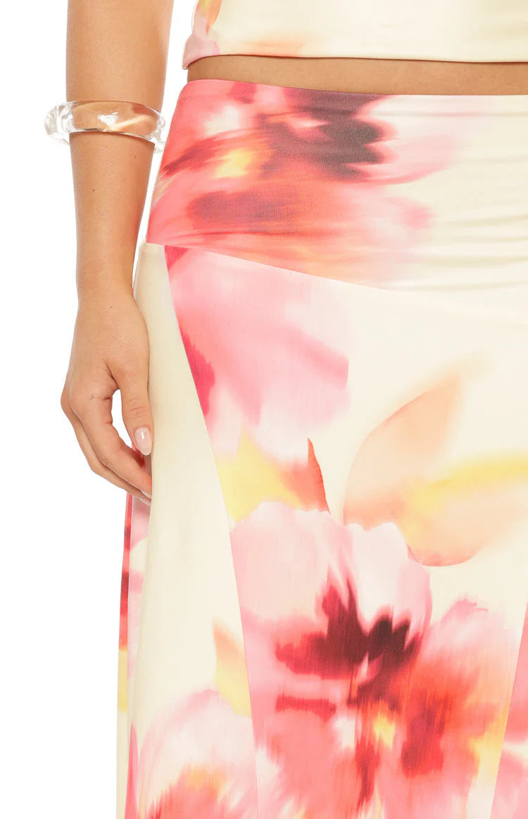 Yellow and Pink Floral Print Stretch Maxi Skirt