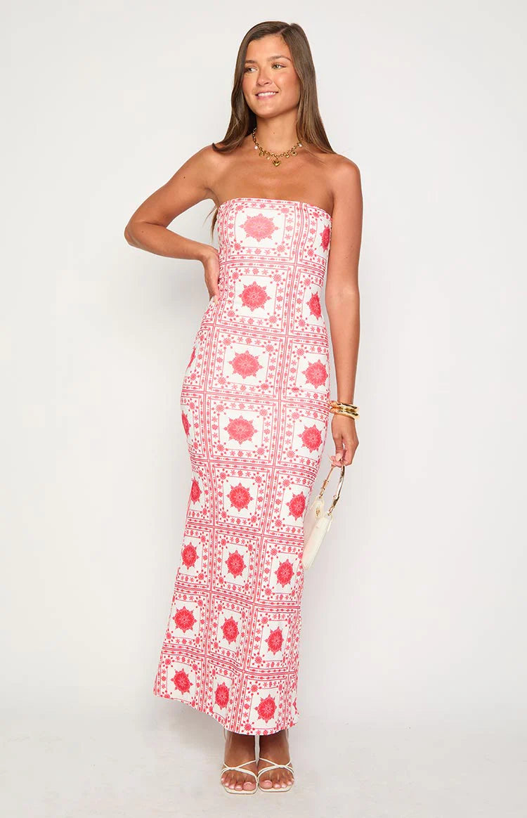 Make a vibrant statement in our Arizona Red Tile Print Maxi Dress! The strapless design and striking pattern create an effortlessly refined look, perfect for your next vacation or summer soir¨¦e! Pair it with delicate gold jewellery and strappy sandals for an elevated ensemble.