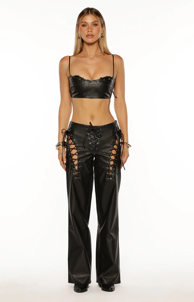 Make a statement in our Austin Black PU Leather Lace Up Pants. These pants command attention with a classic straight-leg fit and functional lace-up details down the front. Pair them with a corset top and heels for your next night out.