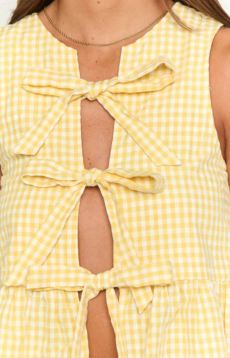 Add a playful pop to your wardrobe with our Baxter Yellow Gingham Top! Made from a lightweight, non-stretch fabric, this sleeveless top features a charming gingham print and three ribbon front ties for an adjustable fit. Pair with the matching Baxter Yellow Shorts for an effortlessly adorable look perfect for casual outings, picnics, or sunny days!