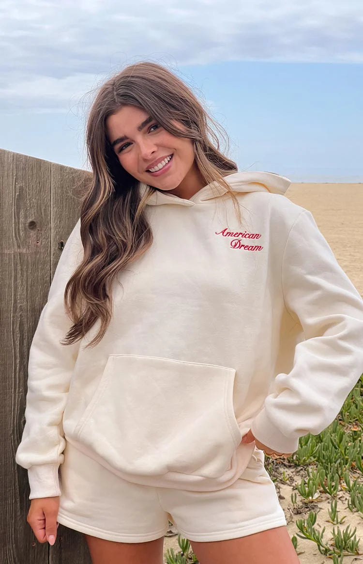 Achieve ultimate comfort and laid-back style with our Beginning Cream American Dream Lounge Shorts! The drawstring and elastic waistband provide a comfortable fit, while the "American Dream" appliqu¨¦ adds a playful touch. Pair them with the matching hoodie for a coordinated and cosy look, or team them with a simple tee for a relaxed everyday vibe.