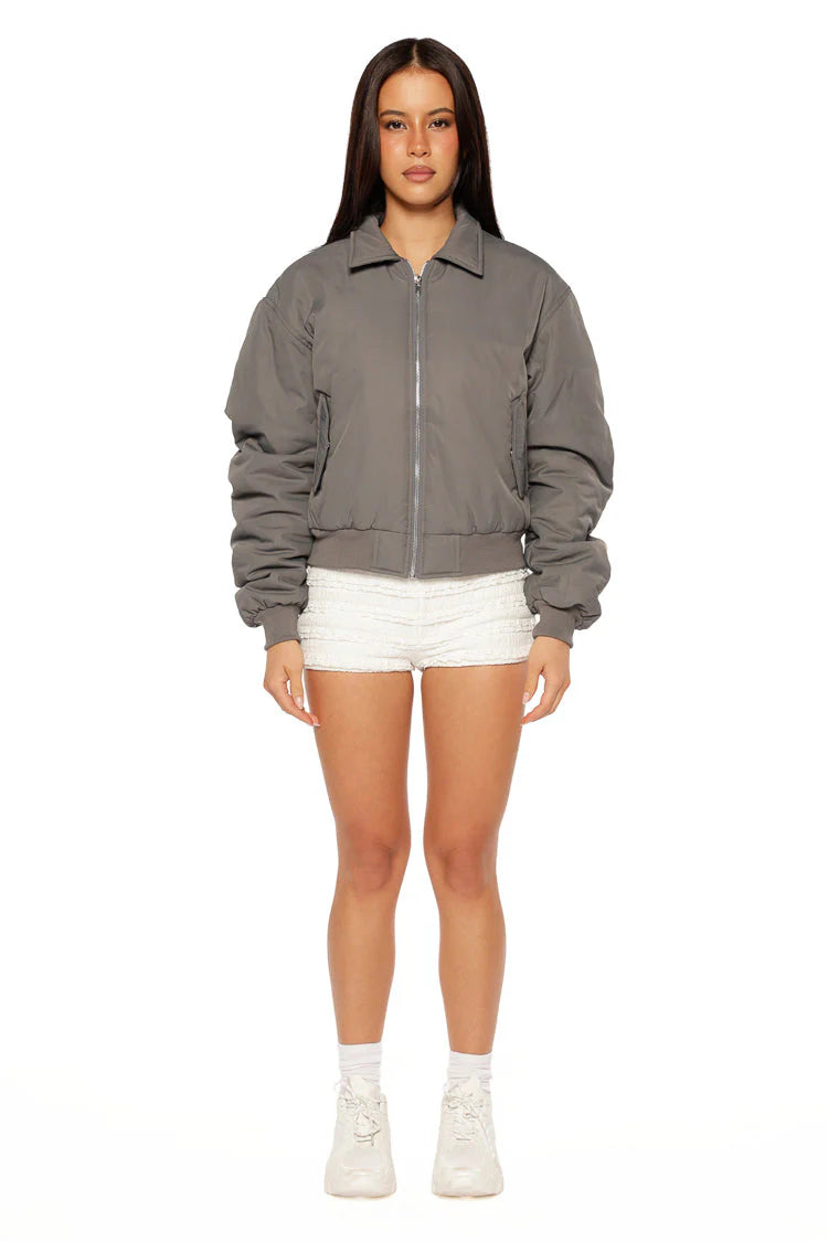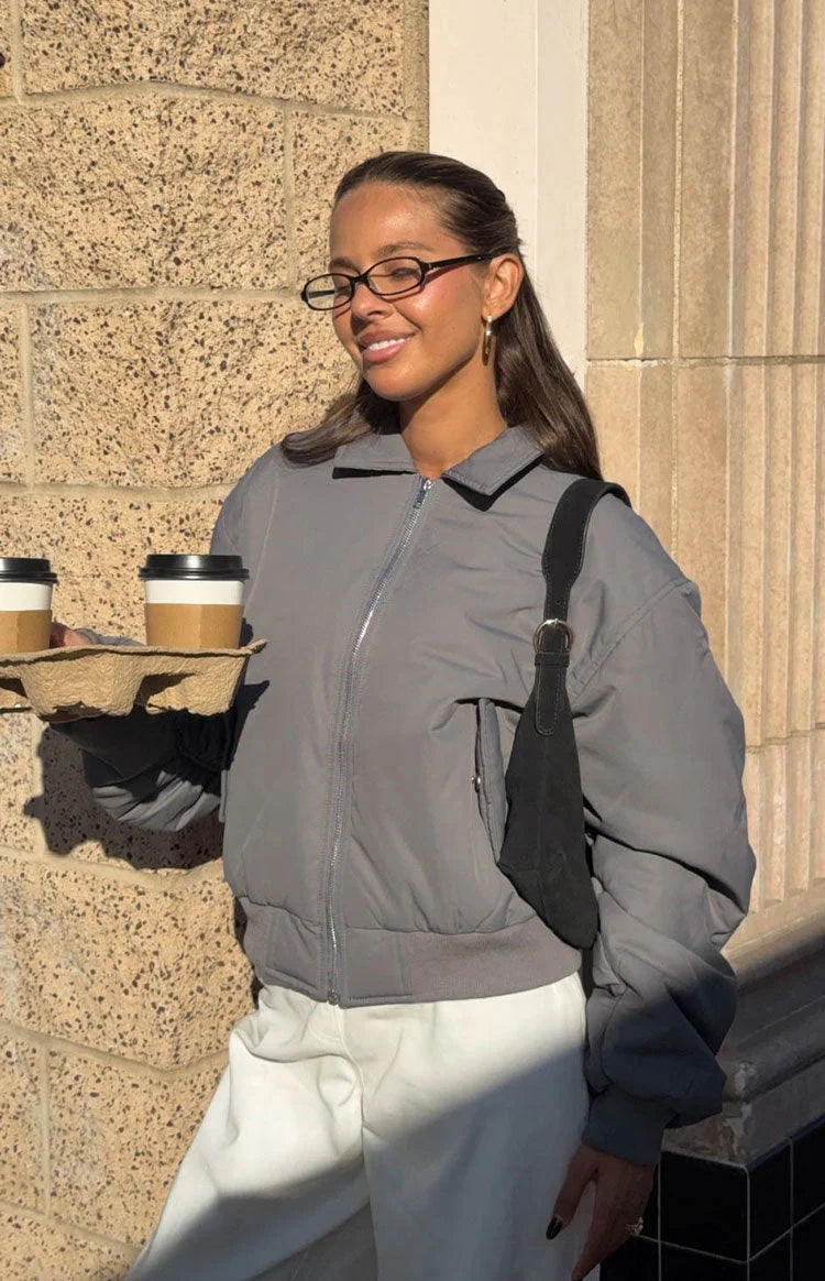 Elevate your street style with our Benson Grey Puff Bomber Jacket, the perfect layering piece for cooler days! This padded bomber adds a sophisticated twist to a classic silhouette, featuring a unique ruching detail across the back and down the sleeves. Layer it over a mini dress and pair with chunky boots for a confident, fashion-forward look.