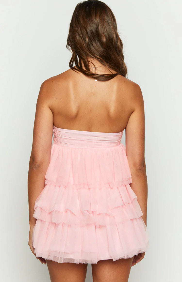Make a statement at your next party event in this pink strapless mini dress! Featuring a stunning tiered design, pair with white strappy heels and gold jewellery to look effortlessly gorgeous!