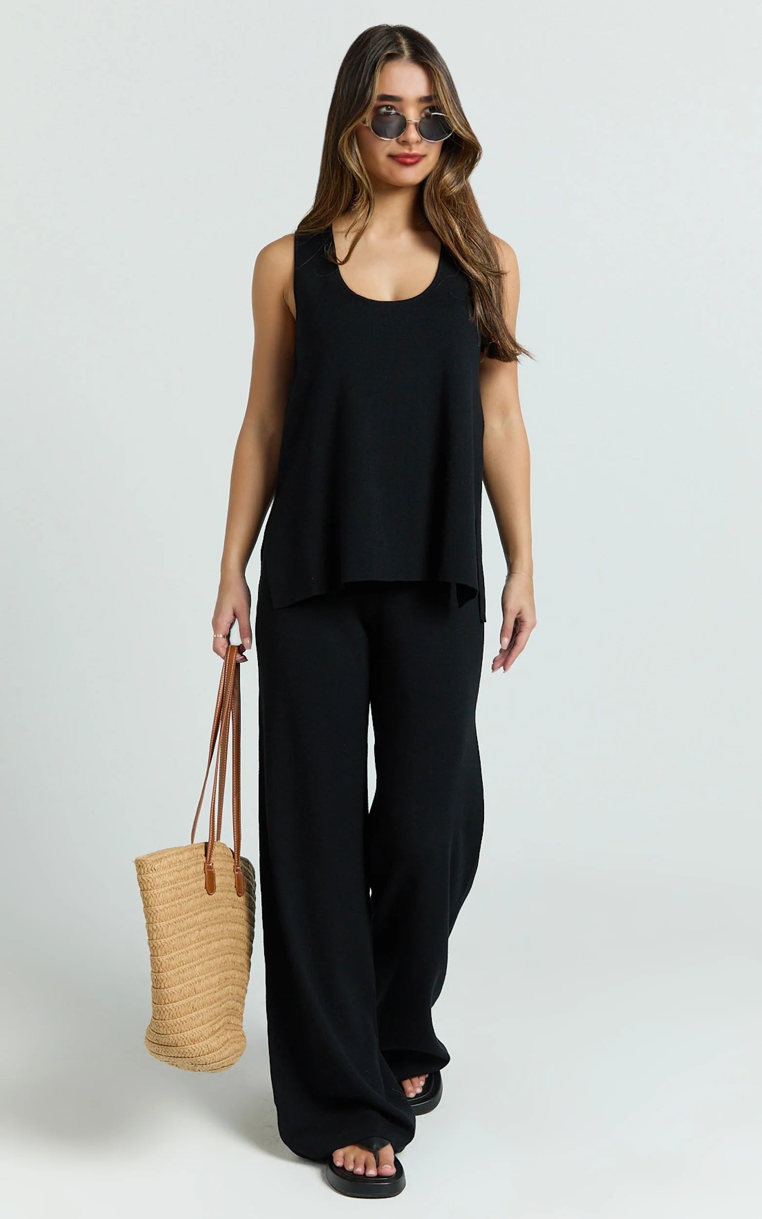 This black knit two-piece set of shell top and pants effortlessly gives an integrated look. Wear them together for a sleek monochromatic effect or mix the top and pants with your favorite items in the wardrobe for various outfit combinations. It's a modern essential that combines refined minimalism with high versatility.