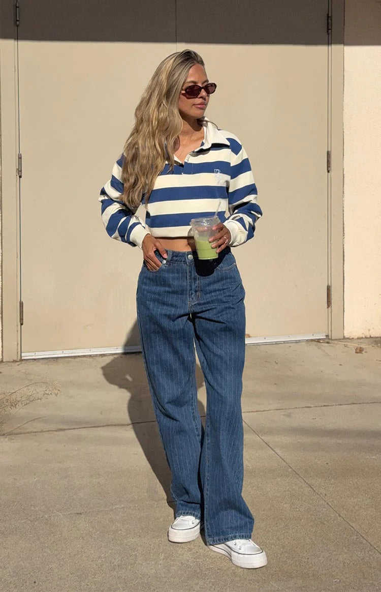 Introducing your new favourite 'cool girl' denim, our Calliope Pinstripe Slouchy Jeans, designed for effortless everyday style! These jeans feature a classic mid-rise waist, a relaxed slouchy fit through the leg, and a subtle pinstripe detail for a touch of sophistication. Pair them with a simple tank or a baby tee and sneakers for a timeless and on-trend look!