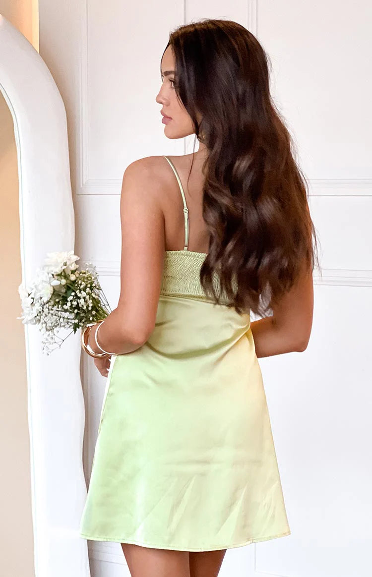 Our Chantell Sage Mini Dress is a dreamy addition to your summer wardrobe or next event outfit! Designed with tuck detailing on the bust, thin adjustable straps, and a soft satin finish, it combines elegance and comfort with ease. Style with dainty gold jewellery and heels for a pretty and polished look.