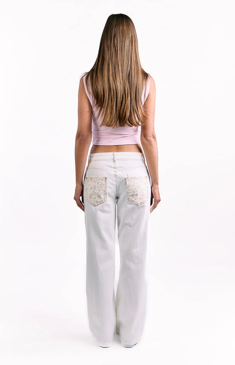 Designed for easy style and ultimate comfort, our Charli White Baggy Jeans are a fresh addition to your denim collection! Crafted from a crisp white denim, these jeans feature a relaxed, low-rise silhouette and a sweet floral appliqu¨¦ on the back pocket for a unique touch. For a monochromatic look, pair them with a white bodysuit and sandals.