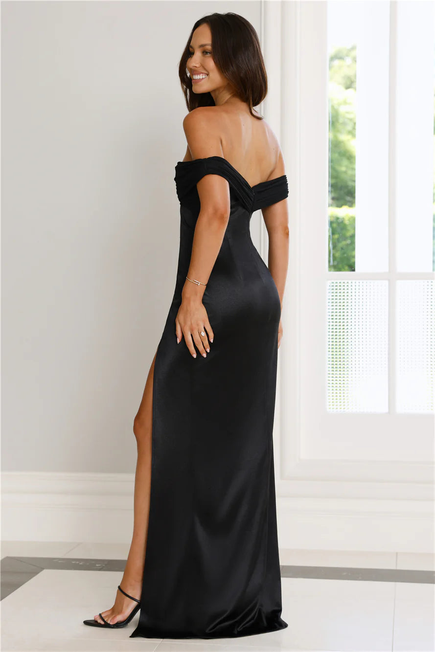 The Couture Enchantment Off Shoulder Maxi Dress is pure magic with its satin flow, off-the-shoulder design, mesh top detailing, and a sultry split to the skirt that makes every move enchanting. Just add heels and get ready to steal the spotlight!
