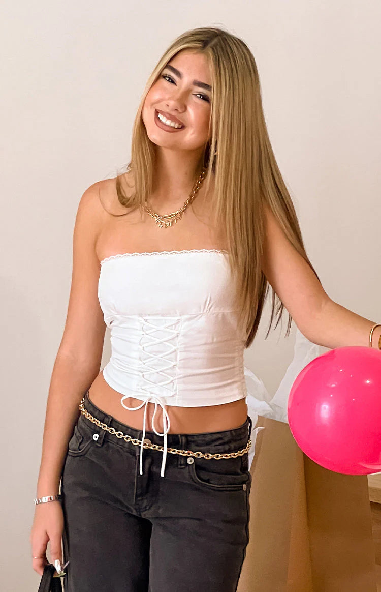 Elevate your wardrobe with our stunning Dakota White Strapless Top, a true statement piece! This elegant top showcases a sleek, strapless silhouette and is defined by its modern lace-up waist detail, creating a look that's both polished and playful. For a sophisticated evening look, pair it with tailored pants and heels.