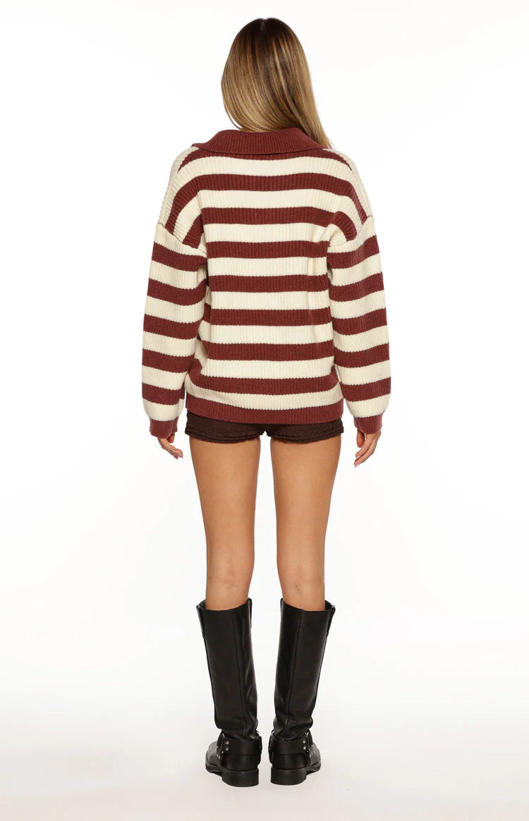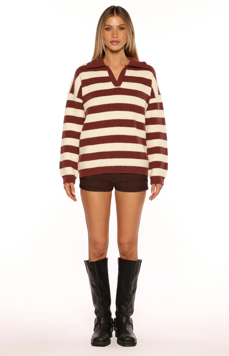 Embrace effortless cool in our Daze Burgundy Stripe Polo Knit Sweater. Featuring a soft-feel knit with a classic burgundy and cream stripe, this piece has a cosy, oversized fit and polo neckline. Throw it over shorts or a mini skirt for a laid-back yet put-together festival look.