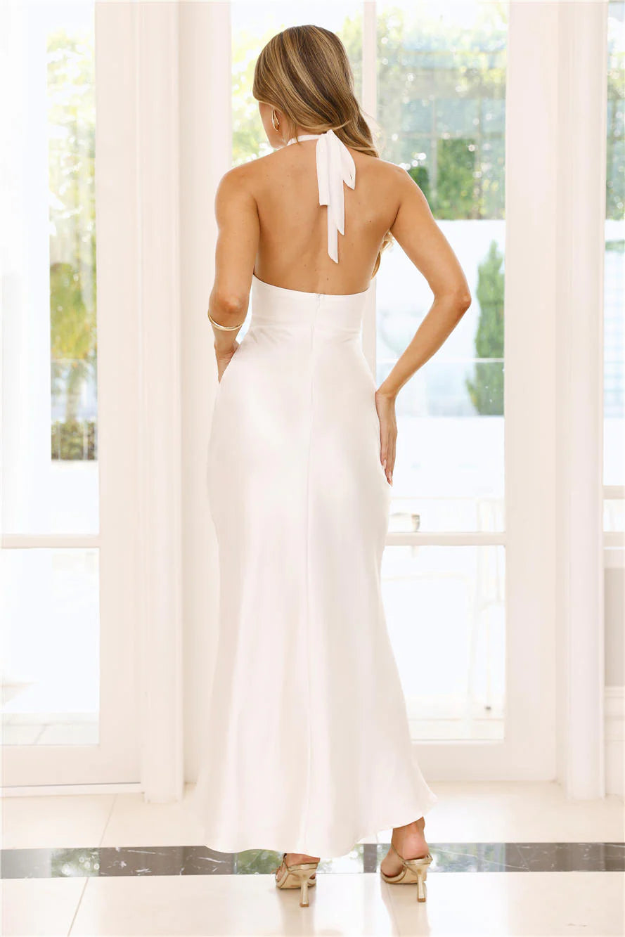 Be seen and admired in the Dream Design Halter Satin Maxi Dress. It features a mesh top, a satin skirt, and a cutout to the bodice with knot details. Style with heels!