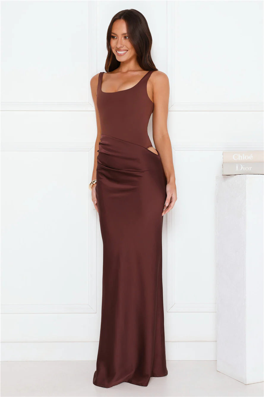 The Effortlessly Yours Satin Maxi Dress features a stretch bodysuit-style top with convenient snap closures, a flowing satin skirt and a slit to the waist. Style with heels.?