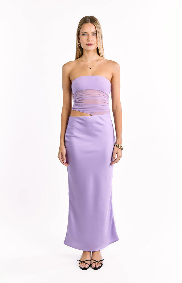 Discover a dream of a dress in our Elinor Lilac Satin Maxi, a breathtaking choice for formals or as a wedding guest! It features a unique ruched mesh bodice for a hint of allure, balanced by a stunning bias-cut satin skirt that drapes elegantly. Style it with simple heels and delicate silver jewellery to let the details shine.