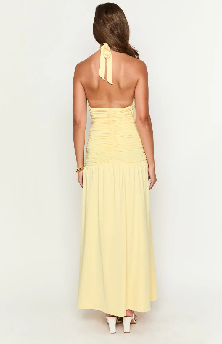 Our Gloria Yellow Maxi Dress is the perfect choice for a sophisticated and elegant look! Featuring a beautiful halter neck tie and a flattering gathered bodice with ruching, the Gloria is fully lined with a stretch jersey fabric and is made with comfort and style in mind. For your next cocktail evening, finish off this look with strappy heels, gold bangles, and a styled updo, and be the star of the night!