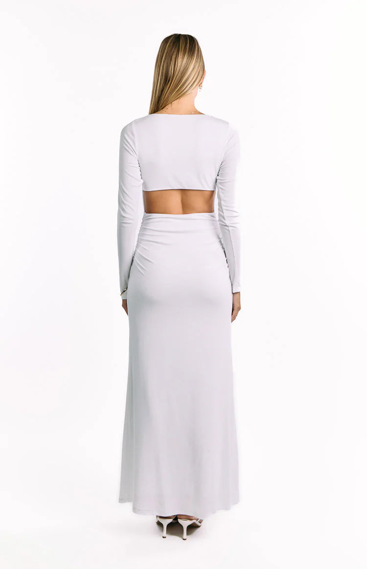 Elevate your wardrobe with our Grayson White Maxi Dress, perfect for your next date night or evening out! Crafted from a comfortable stretch rib jersey, it features long fitted sleeves and a cut out back for an effortlessly stunning silhouette. Simply pair it with heels and your favourite gold jewellery for a polished look.