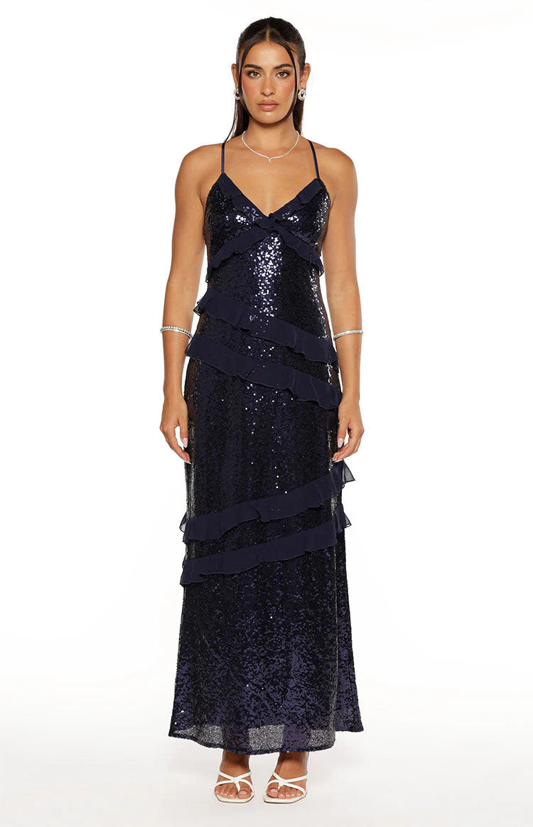 Make a sparkling impression in our Inara Navy Sequin Ruffle Maxi Dress, designed for formal events and cocktail parties! This maxi features a stunning sequin base with delicate chiffon ruffle detail and an adjustable lace-up back for a refined fit. Style it with strappy heels and minimal jewellery to keep the focus on the eye-catching fabric and elegant silhouette.