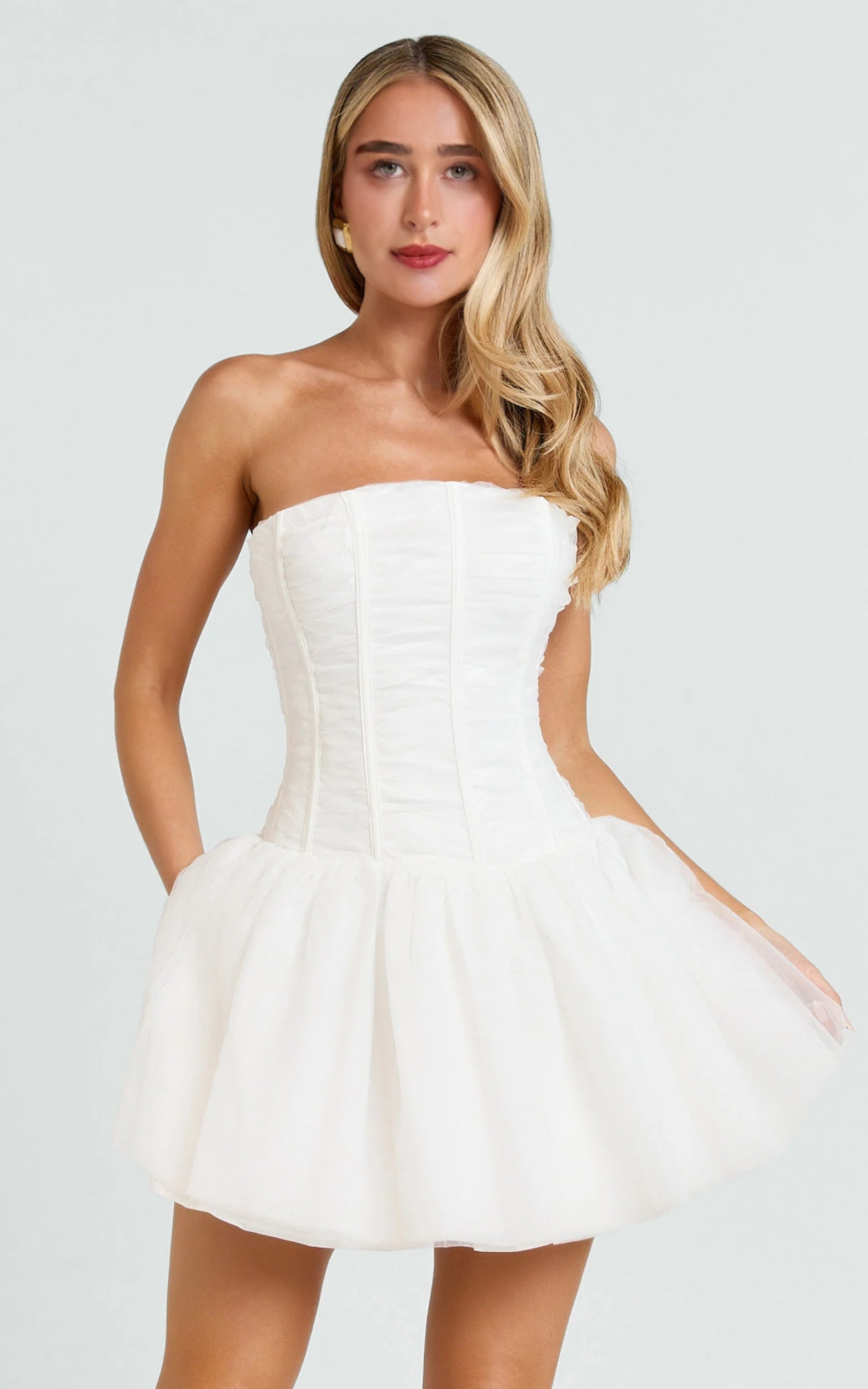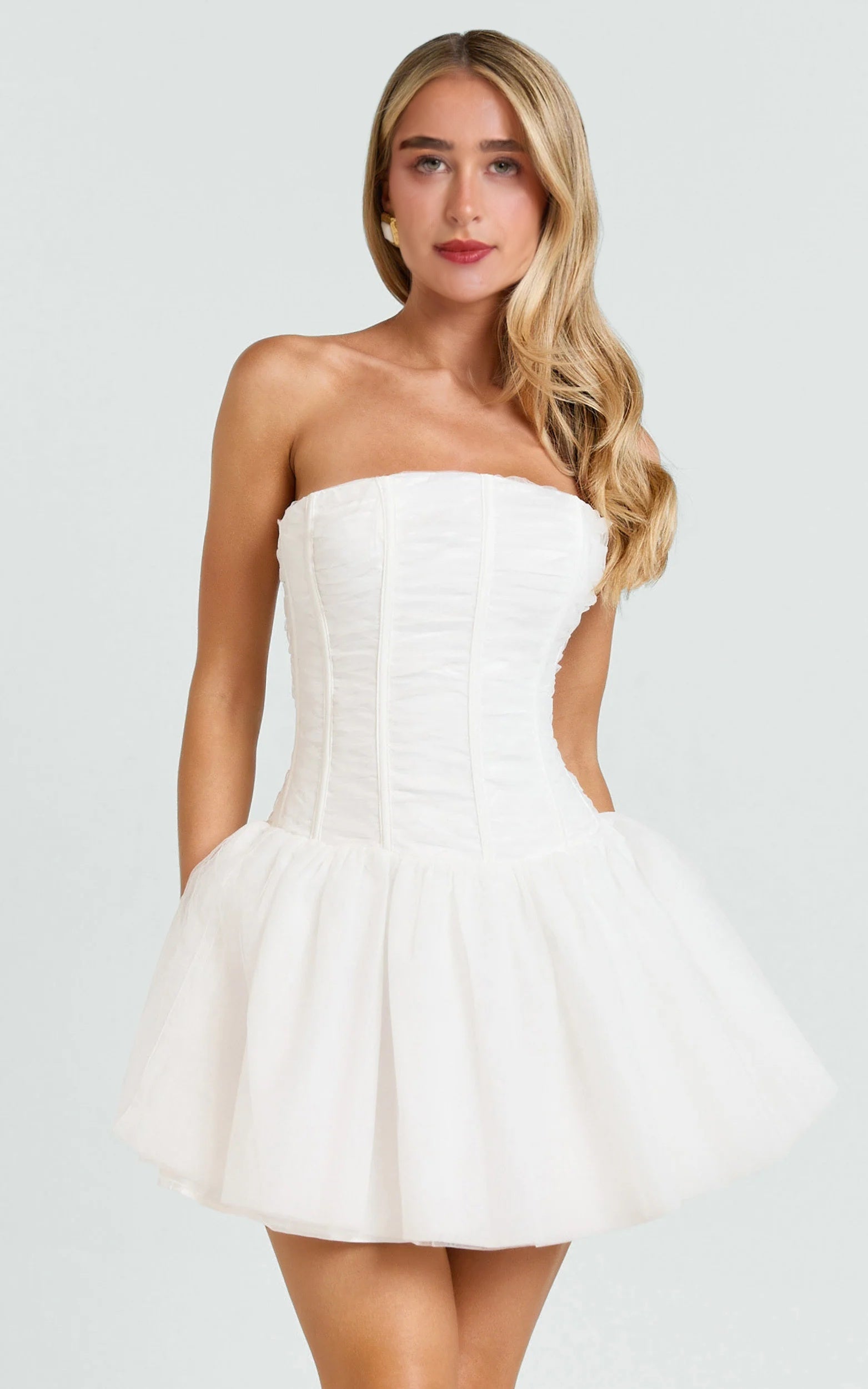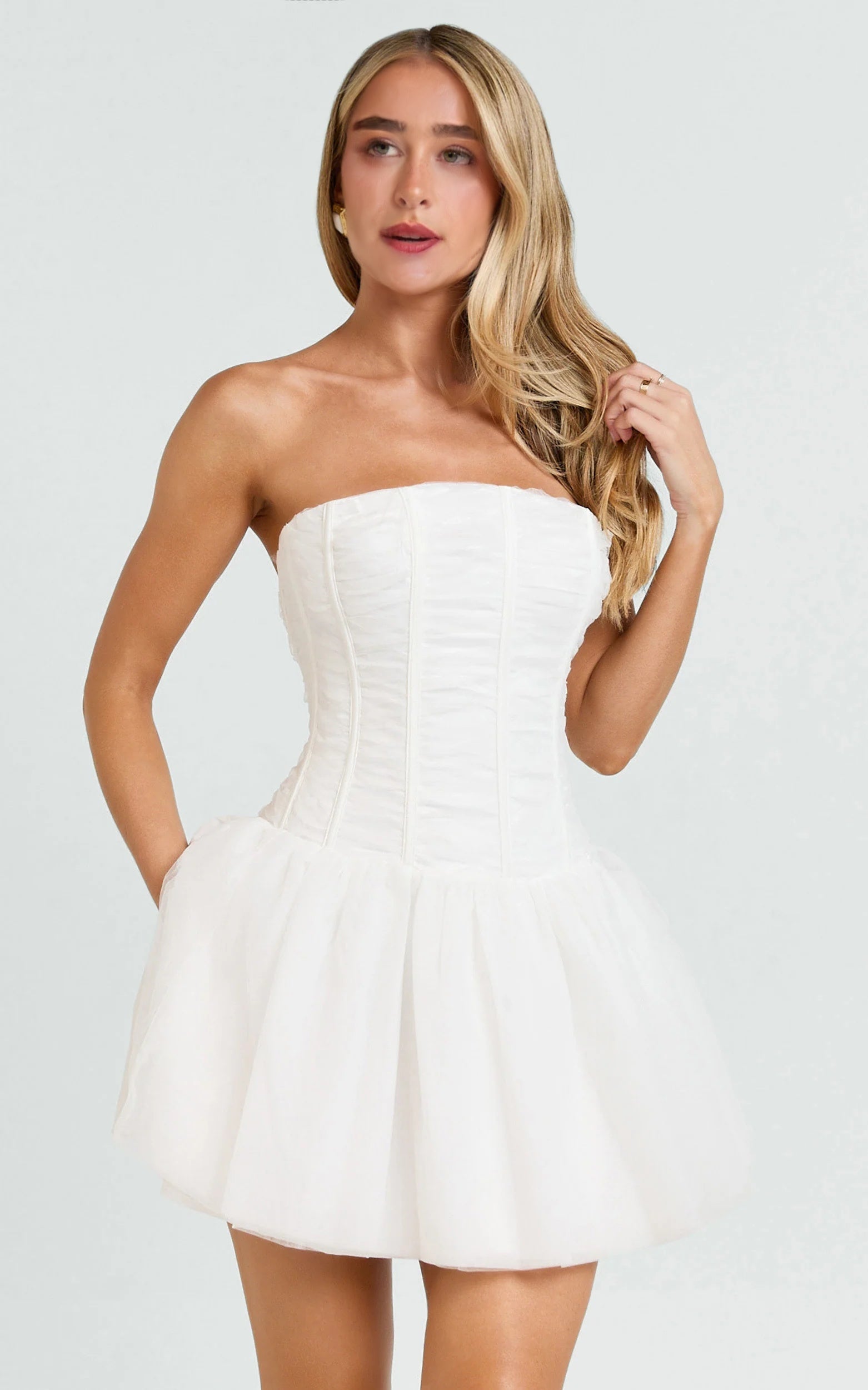 A corset top with ruched cups and a gathered skirt enhances the figure in all the right spots, exuding an elegant party vibe with a touch of understated luxury. The pure ivory color makes it a classic choice, while the playful hem adds movement, perfect for dance floors, dates, and more, proving that dresses can be both eye - catching and easy to wear.
