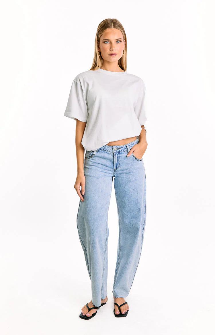 Elevate your denim collection with our Jannina Light Wash Jeans, the on-trend staple for effortlessly cool everyday style! Featuring a relaxed barrel leg and a raw hem, these low-rise jeans are finished with edgy stud detailing around the front and back pockets. Style them with a baby tee and sneakers for a perfect model-off-duty look.