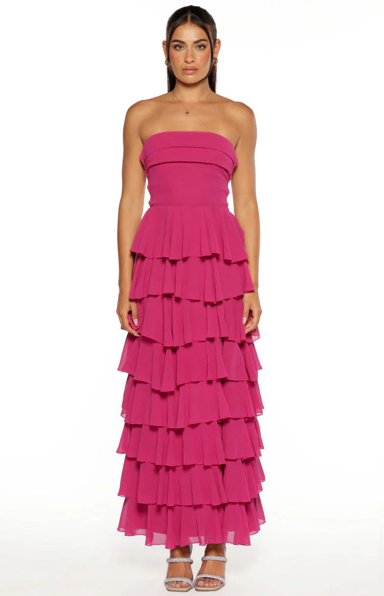 Make a bold impression in our Kim Fuchsia Strapless Ruffle Maxi Dress, the perfect piece for prom or a statement wedding guest look! This maxi features a striking fuchsia colour, a strapless fold-over panel, and dramatic tiered ruffle detail on the skirt with a thigh split. Complete the look with strappy heels and a sleek updo to complement the strapless neckline and accentuate the lace-up back details.