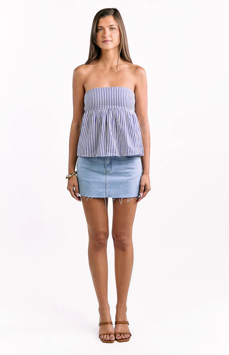 Effortless summer style starts here with our Klee Dark Blue Strapless Top, a must-have for your next vacation! This breezy top features a classic stripe print and a sweet, adjustable tie-back detail for the perfect fit. Pair it with white linen pants and sandals for a fresh, coastal-inspired look.