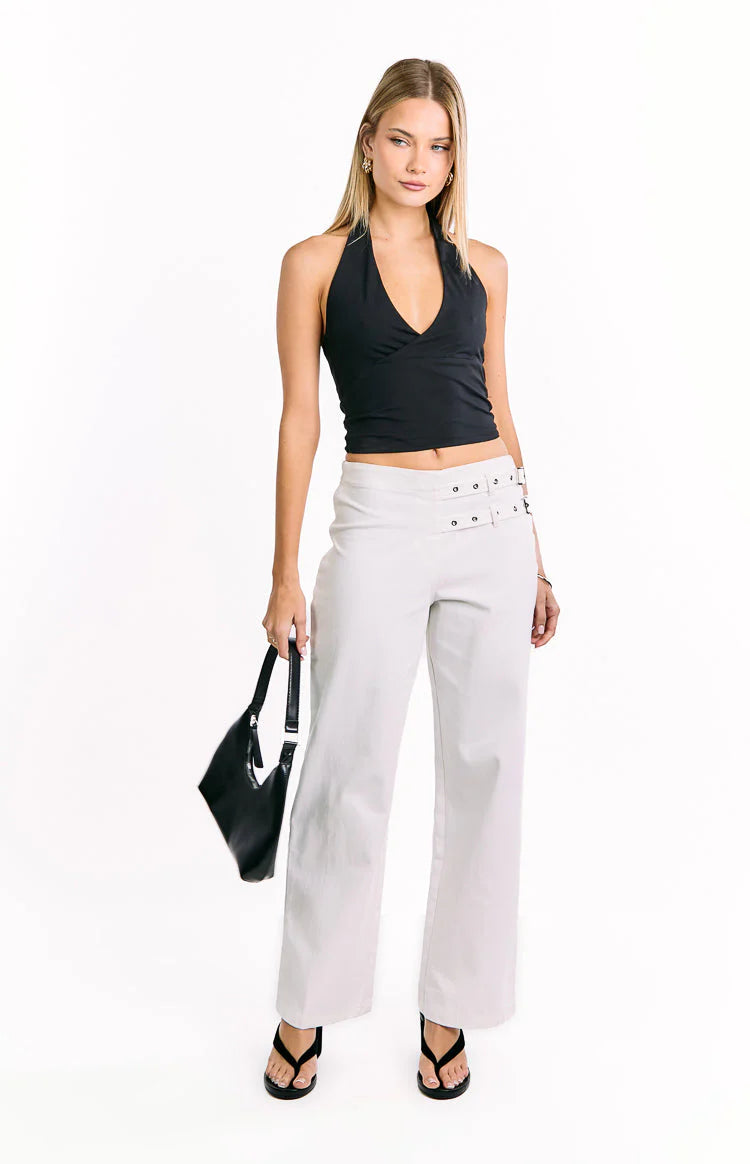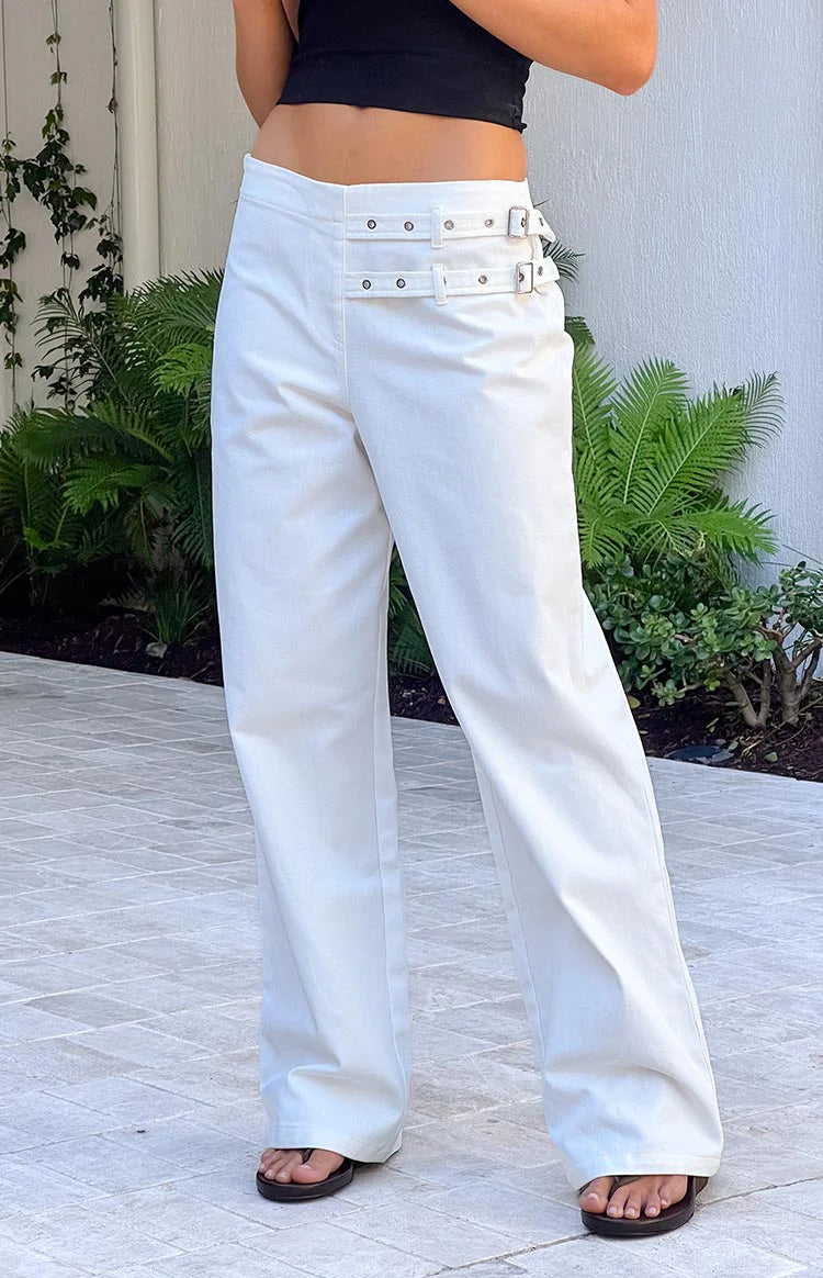 Elevate your wardrobe with our seriously cool Lila Off White Buckle Pants, your new go-to for polished dressing! These pants feature a flattering mid-rise fit and a statement double buckle detail in silver for a modern edge. Style them with a fitted bodysuit and heels for a sophisticated look that works for day or night.