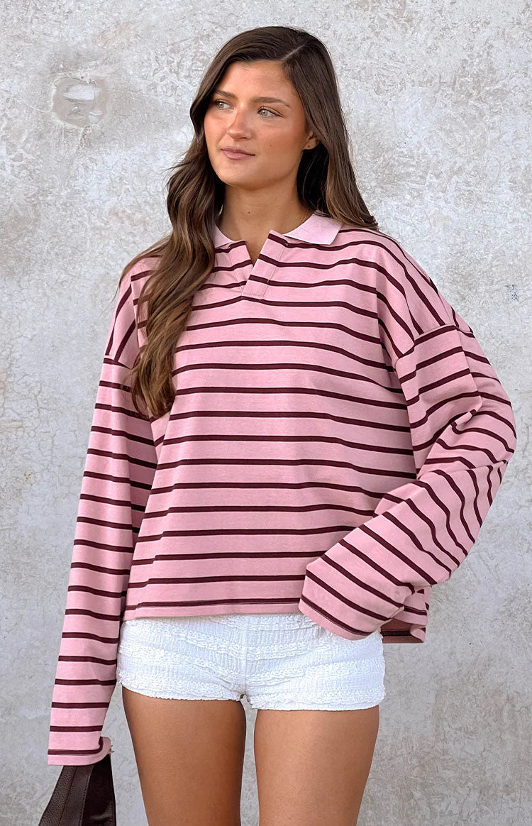Meet your new wardrobe staple for relaxed weekends, The Rebels Jersey in a beautiful burgundy blush stripe! Featuring a classic button placket collar and a comfortable loose fit, this jersey blends a preppy, collegiate feel with effortless style. We love it styled with a white mini skirt and sneakers for a playful, off-duty look.