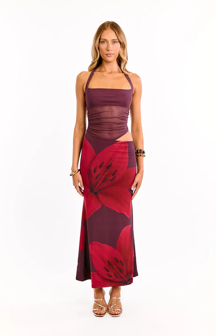 Embrace an elegant vibe at your next summer wedding in our Lucinda Purple Floral Cut Out Maxi Dress! Designed with a flattering halter neckline, this dress is defined by its sheer mesh waist panel, creating a stunning silhouette. For a perfect day look, just add sandals and your favourite sunnies.