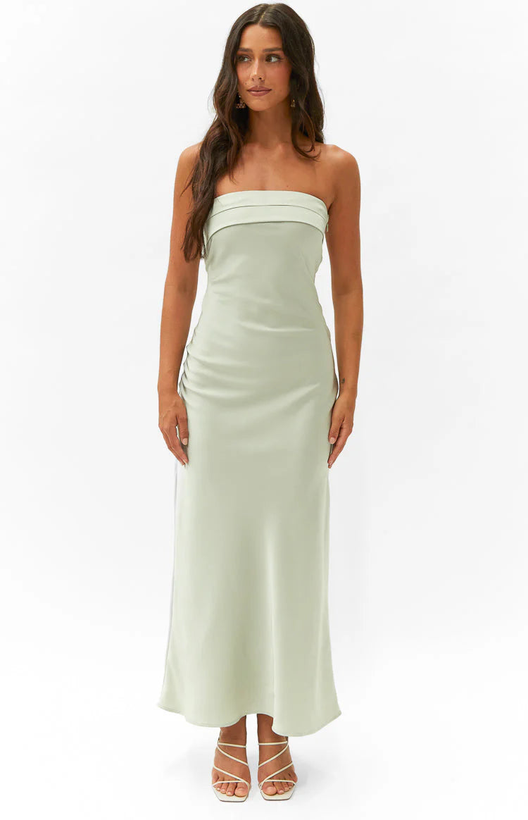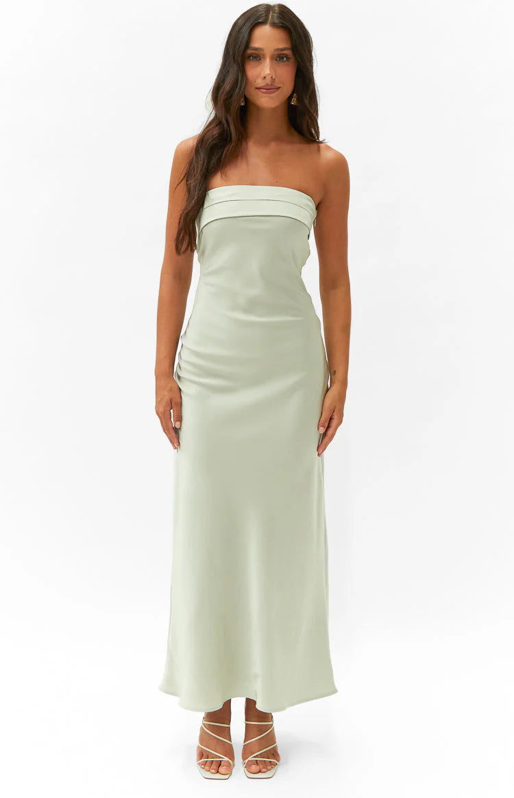 Your next gorgeous cocktail look is here! Wear this strapless satin like maxi dress - so elegant and this colour is so chic! Slide into heels and pop your favourite gold accessories for your next evening fit.