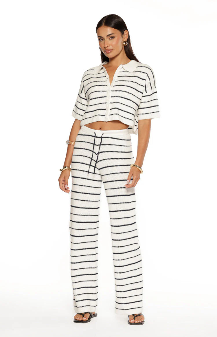 Designed for easy style and ultimate comfort, meet our Maple White Navy Stripe Knit Pants are your new go-to for casual outings or a comfy day at home. Crafted in soft stripe knit fabric, these pants feature a classic mid-rise fit and an adjustable drawstring waistband for a custom, relaxed fit. Pair them with a simple white basic top and sneakers for a cute and comfy look!
