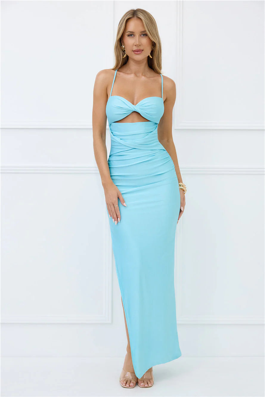 You'll be fancy event-ready in the DEAR EMILIA Meet The Queen Maxi Dress Midnight. Featuring a gorgeous twist front and a crisscross back design. Be seen and admired, girl. Style with heels for an extravagant 'fit.