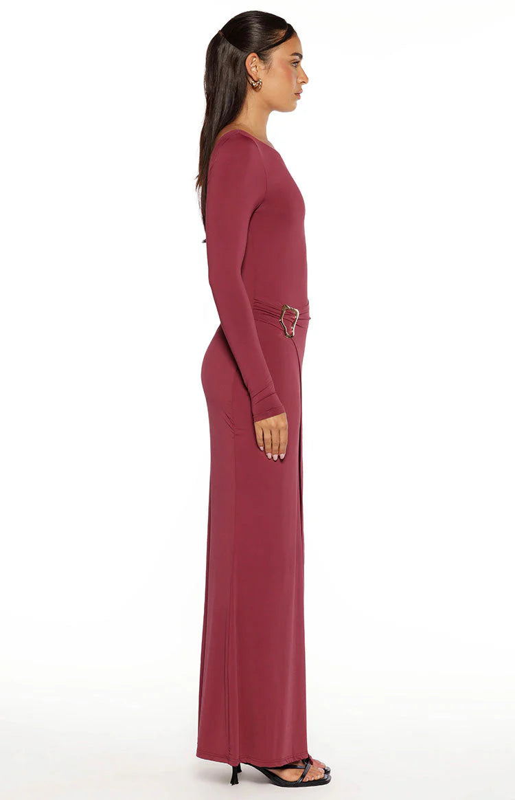 Elevate your evening look with our Misaki Burgundy Long Sleeve Wrap Maxi Dress, a refined choice for cocktail events or a special date night! Crafted from soft jersey material, this maxi features an elegant boat neckline and a flattering wrap detail at the front, cinched with a luxe gold buckle. Complete the look with heels and minimal gold jewellery for a polished and effortless ensemble.