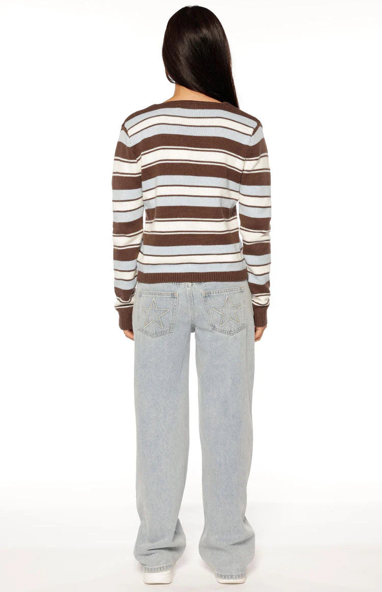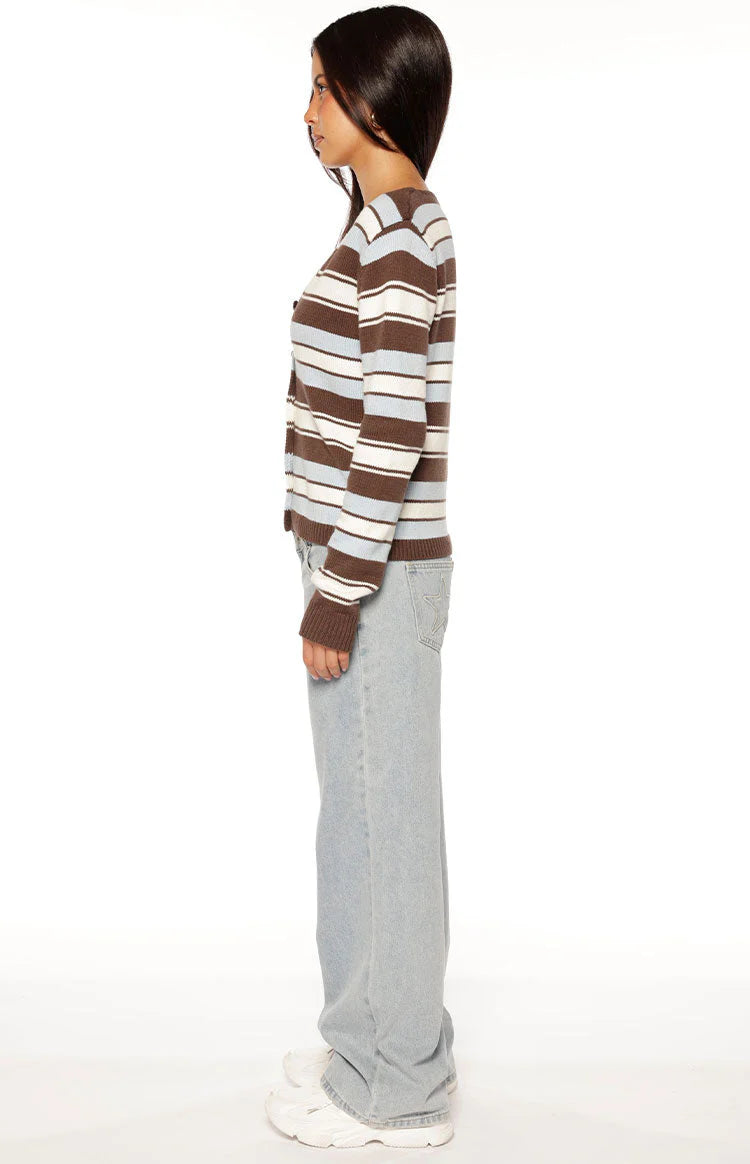 Your new favourite knit has landed! Meet the Misha Brown and Blue Stripe Button Down Cardigan, a cozy layering piece for any casual day. Crafted from a mid-weight knit, this cardigan features a flattering V-neckline and a fun multi-stripe print. Layer it over a simple cami with high-waisted denim and flats for an effortlessly put-together look.