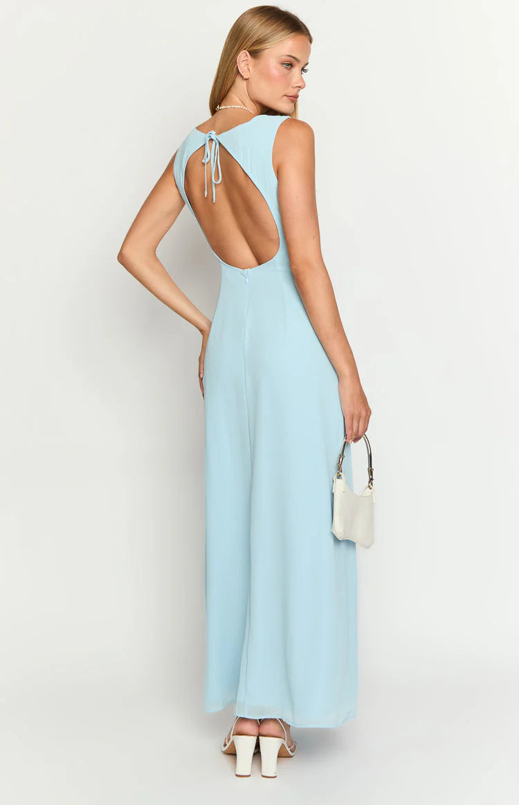 Make a statement at your next formal or cocktail event with our stunning Misty Light Blue Chiffon Maxi Dress! Featuring a flattering cut and an open back design, this dress is the perfect blend of elegance and allure. Complete your look with white heels and jewellery in your favourite metal for an effortlessly chic finish.
