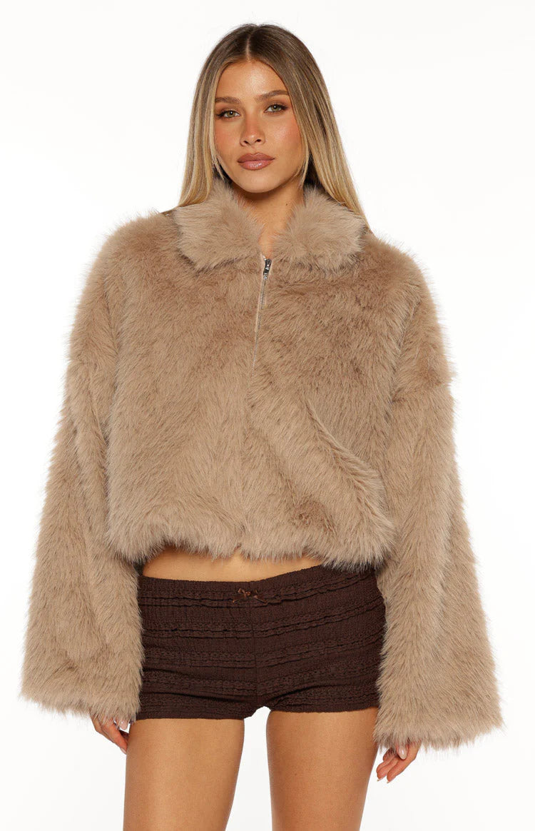 Light Brown Faux Fur Zip Up Jacket