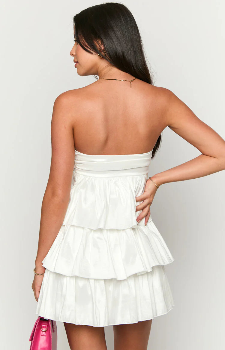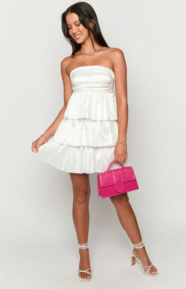 The One Wish White Strapless Mini Dress is to die for! Featuring the cutest tiered ruffle silhouette and strapless style, this dress is perfect for parties in the summer time. Finish your look with gold earrings and white strappy heels!
