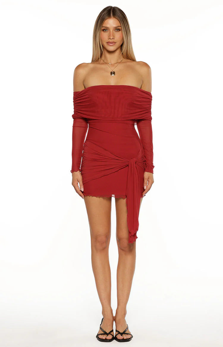 Designed to sculpt and flatter, our Paige Red Off The Shoulder Mini Dress is a captivating choice for your next date night or cocktail party. This stunning mini features an elegant off the shoulder neckline with long sleeves and dramatic ruching that contours the body. Let the silhouette be the focus and pair it with barely-there heels for a polished finish!