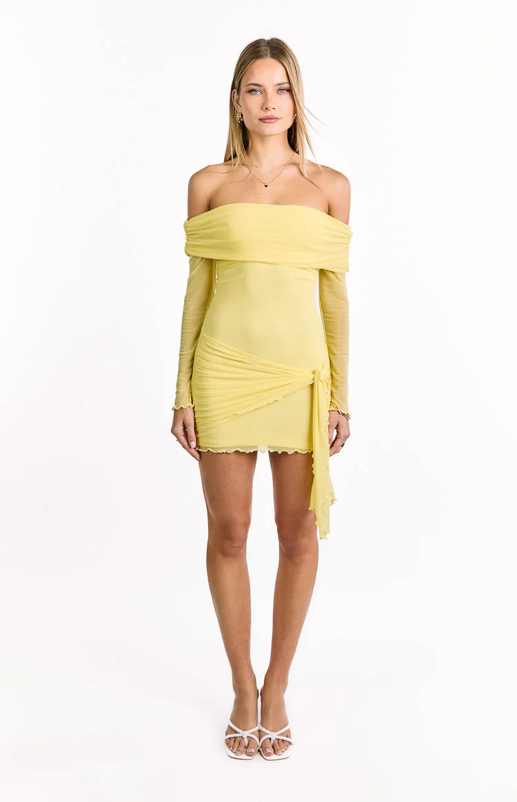 Ready to turn up the fun? Meet our Paige Yellow Mini Dress, your new favourite for parties and birthday celebrations! This eye-catching dress features a flattering off-the-shoulder neckline and is fully ruched to hug your curves in all the right places. Complement the vibrant yellow with gold jewellery and your favourite heels.