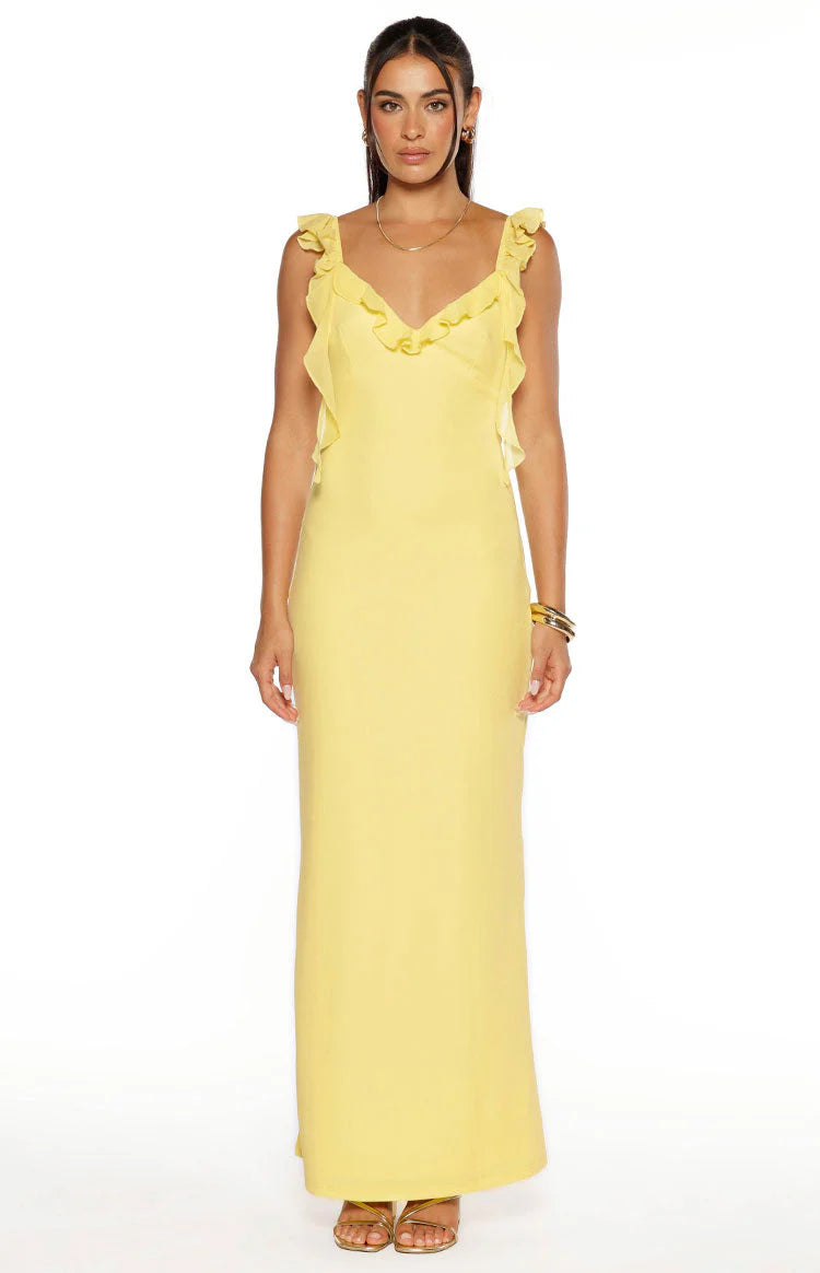 Radiate vibrant elegance in our Paolma Yellow Ruffle Formal Maxi Dress, a gorgeous choice for daytime formals or a sophisticated wedding guest look! This maxi features a flattering stretch crepe fabric, an elegant low open back, and delicate chiffon ruffle strap detail with tassels. Simply pair with strappy heels and gold jewellery for a polished and ethereal finish.