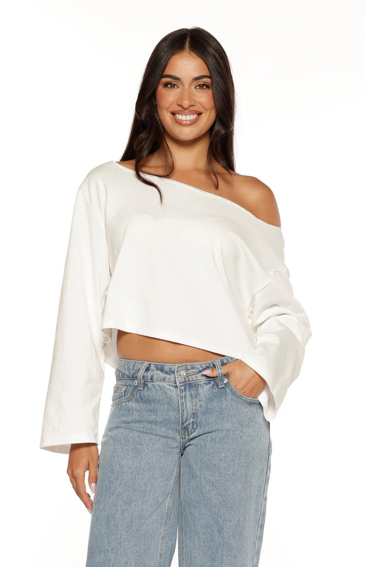 Effortless style starts here with our Phoenix White Off Shoulder Long Sleeve Top, your new go-to for casual outings and weekends! This oversized, loose-fit top is made from a comfortable stretch material and features a relaxed off-shoulder neckline with a cool hand-cut raw-edge detail. Pair it with light-wash denim or your favourite casual pants and sneakers for an effortless cool-girl look!
