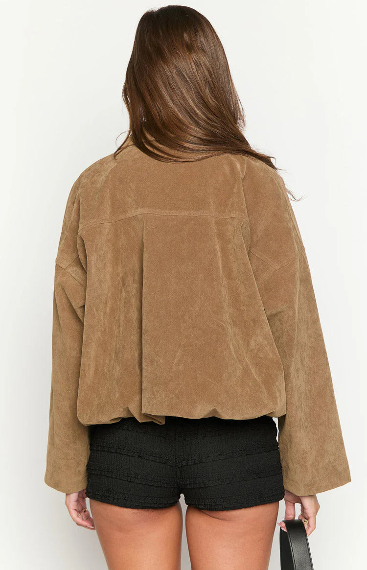 Our River Brown Suedette Bomber Jacket is the ultimate outerwear staple for a cool-girl take on effortless layering! Crafted from soft, luxe-feel suedette, it features a subtly structured silhouette with a bubble hem, classic collar, and relaxed fit for that model-off-duty appeal. Style it with a fitted crop top, jeans and pointed boots for a street-style ensemble that¡¯s both refined and ready for anything!