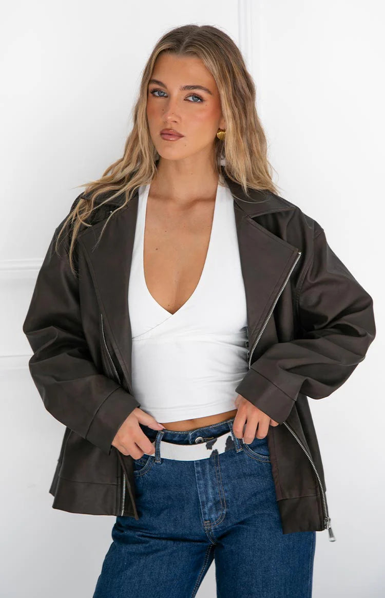 Our Rochelle Chocolate Brown Biker Jacket is the ultimate cool-girl staple, perfect for throwing on over any outfit to add instant edge! Crafted from rich chocolate brown PU, its intentionally oversized silhouette and classic biker zip details deliver that perfect blend of rugged yet chic style. Style it with jeans and boots for an effortlessly cool street-style vibe this winter!