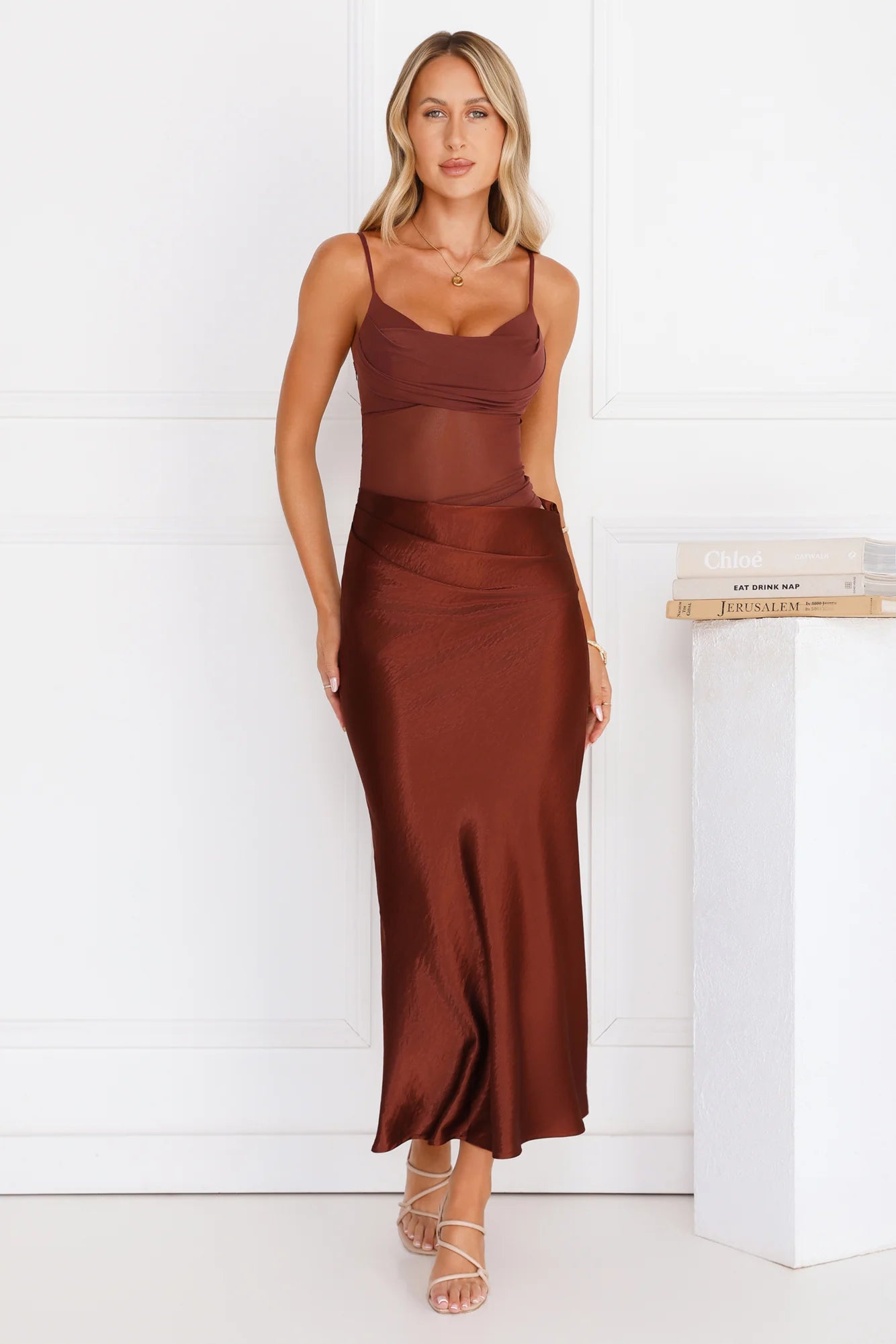 The Rule The Glow Satin Mesh Maxi Dress is your go-to for effortless charm, featuring a mesh top with a cutout to the waist and a silky skirt. Style with heels.