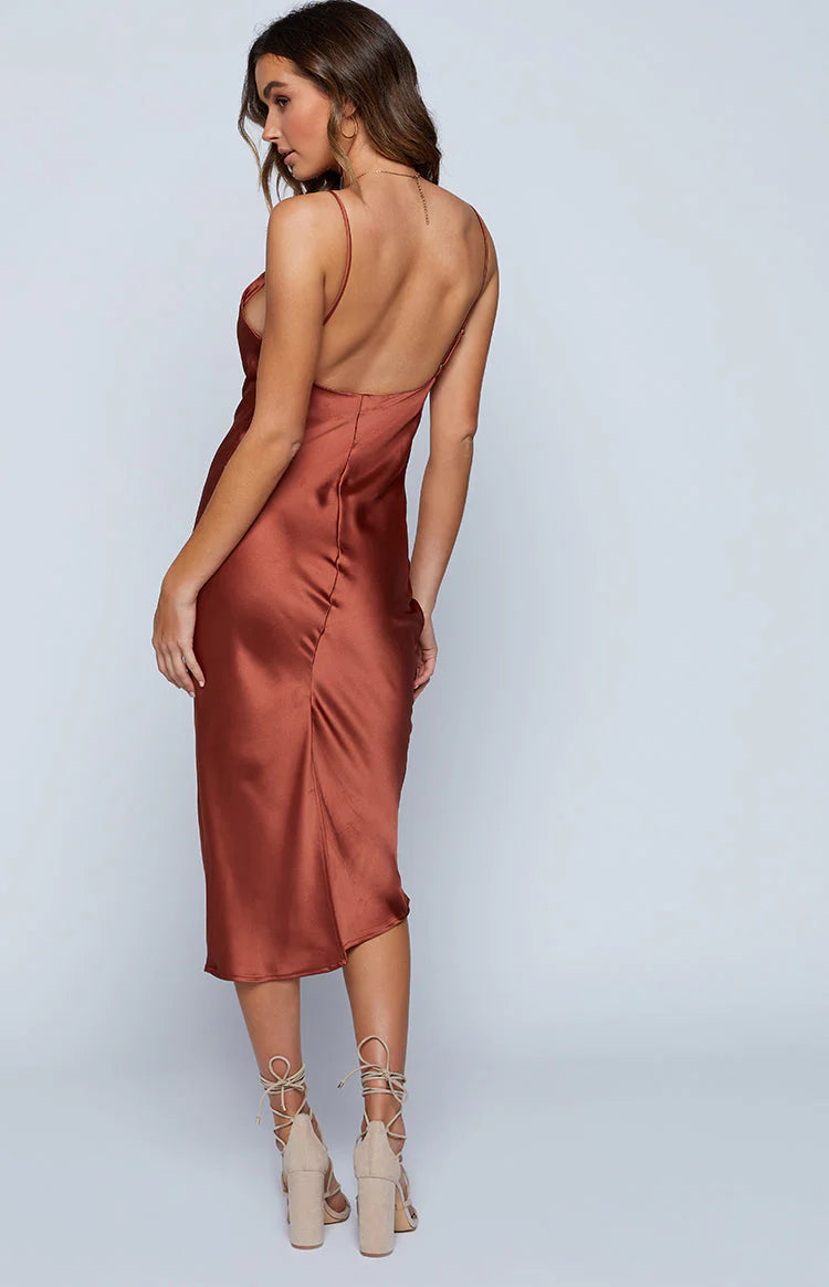 The Schiffer Slip Midi Dress?in rust is the perfect satin?dress for any formal occasion! Featuring a stunning cowl neck this piece is sure to be your next wedding guest or graduation outfit. Elevate by styling with with heels, a black bag and gold dainty jewellery!