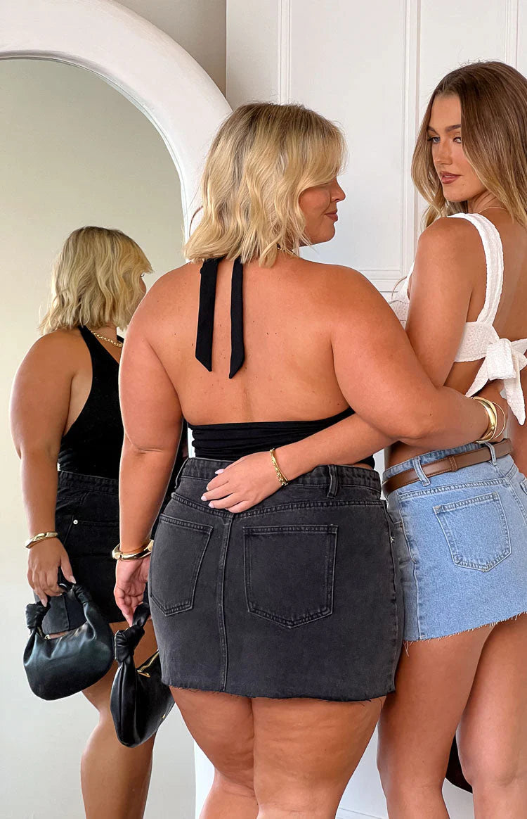 Our Siletto Black Denim Mini Skirt is a must-have staple for any wardrobe! The low-rise fit and frayed hem give it a cool, laid-back vibe, while the two front and back pockets add practicality. Perfect for casual everyday wear, pair it with an off-the-shoulder top and statement earrings for a stunning, effortless look!
