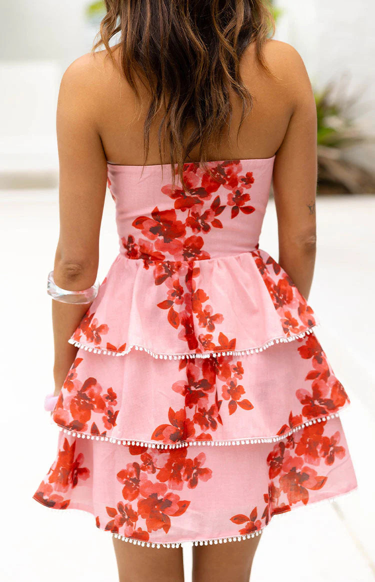 Radiate charm in our Sofia Pink Floral Strapless Ruffle Mini Dress, perfect for day events like brunch or garden parties. This feminine mini is designed with a flattering strapless style and delicate tiered ruffles featuring a picot trim detail. Style this playful piece with simple sandals and a sun hat for an effortless daytime look!