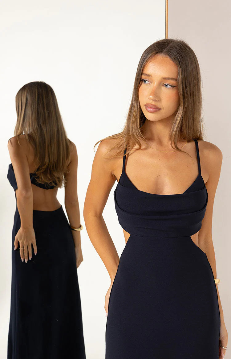 Step into sophistication at your next formal event in our Taleah Navy Crepe Formal Maxi Dress! Crafted from a stretch crepe material, this elegant dress features side cut-outs and a striking open back, creating a stunning silhouette. For a polished finish, simply add a pair of heels and a statement clutch.