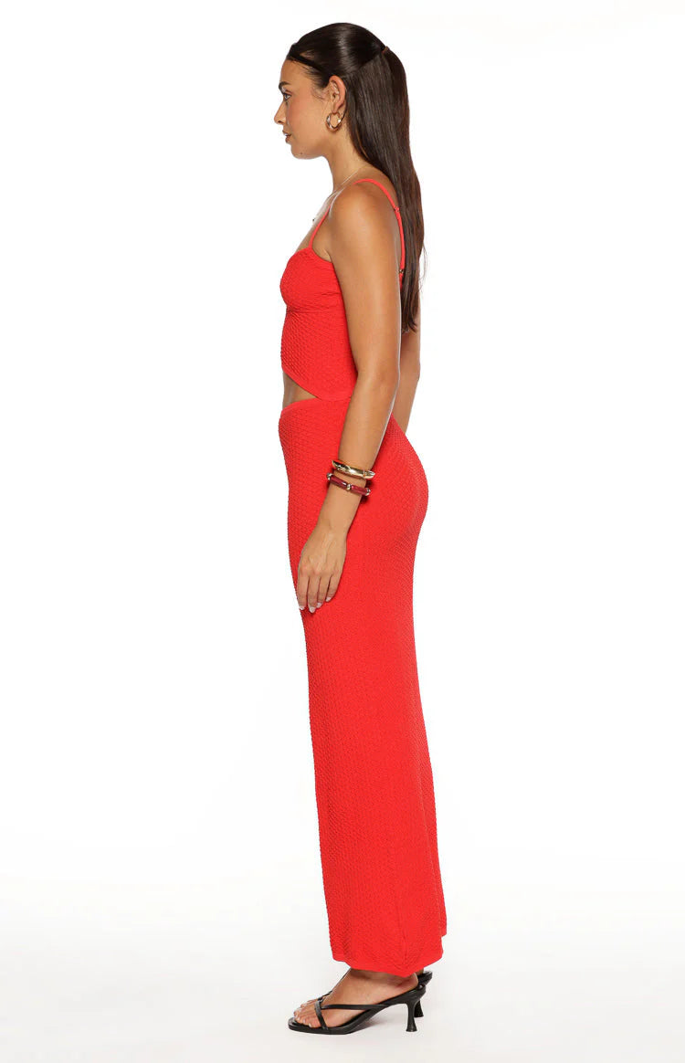 A true statement piece, our Tegan Red Knit Cut Out Maxi Dress is your new go-to for date night or cocktail parties. Crafted from a comfortable stretch knit material, this maxi features a flattering waist cutout detail that adds a contemporary, bold touch. Complete your look with simple strappy heels and gold hoop earrings for an effortlessly glamorous finish!